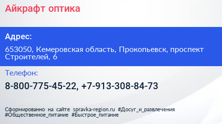 Айкрафт, оптика по адресу 653050, Кемеровская область, Прокопьевск, проспект Строителей, 6 в дальнейшем Организация, размещена в следующих категориях: