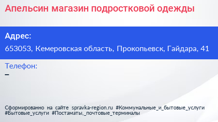 Апельсин, магазин подростковой одежды по адресу 653053, Кемеровская область, Прокопьевск, Гайдара, 41 в дальнейшем Организация, размещена в следующих категориях: