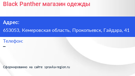 Black Panther, магазин одежды по адресу 653053, Кемеровская область, Прокопьевск, Гайдара, 41 в дальнейшем Организация, размещена в следующих категориях: