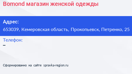 Bomond, магазин женской одежды по адресу 653039, Кемеровская область, Прокопьевск, Петренко, 25 в дальнейшем Организация, размещена в следующих категориях: