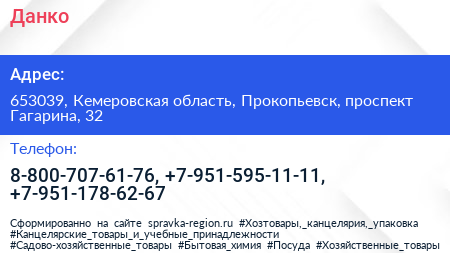 Данко по адресу 653039, Кемеровская область, Прокопьевск, проспект Гагарина, 32 в дальнейшем Организация, размещена в следующих категориях: