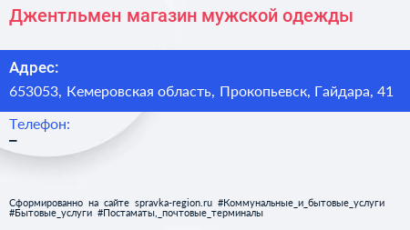 Джентльмен, магазин мужской одежды по адресу 653053, Кемеровская область, Прокопьевск, Гайдара, 41 в дальнейшем Организация, размещена в следующих категориях: