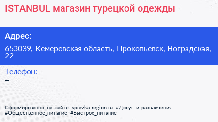 ISTANBUL, магазин турецкой одежды по адресу 653039, Кемеровская область, Прокопьевск, Ноградская, 22 в дальнейшем Организация, размещена в следующих категориях: