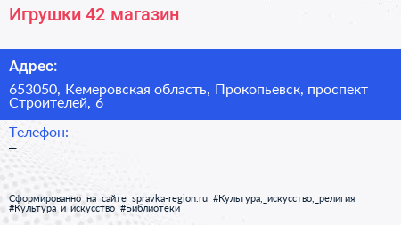 Игрушки 42, магазин по адресу 653050, Кемеровская область, Прокопьевск, проспект Строителей, 6 в дальнейшем Организация, размещена в следующих категориях: