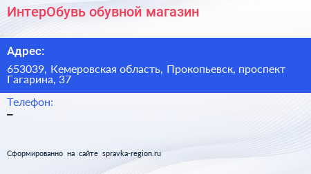 ИнтерОбувь, обувной магазин по адресу 653039, Кемеровская область, Прокопьевск, проспект Гагарина, 37 в дальнейшем Организация, размещена в следующих категориях:
