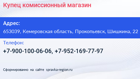 Купец, комиссионный магазин по адресу 653039, Кемеровская область, Прокопьевск, Шишкина, 22 в дальнейшем Организация, размещена в следующих категориях: