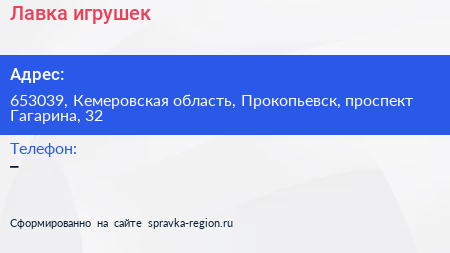 Лавка игрушек по адресу 653039, Кемеровская область, Прокопьевск, проспект Гагарина, 32 в дальнейшем Организация, размещена в следующих категориях: