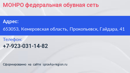 МОНРО, федеральная обувная сеть по адресу 653053, Кемеровская область, Прокопьевск, Гайдара, 41 в дальнейшем Организация, размещена в следующих категориях: