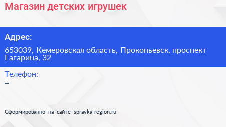 Магазин детских игрушек по адресу 653039, Кемеровская область, Прокопьевск, проспект Гагарина, 32 в дальнейшем Организация, размещена в следующих категориях: