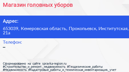 Магазин головных уборов по адресу 653039, Кемеровская область, Прокопьевск, Институтская, 21а в дальнейшем Организация, размещена в следующих категориях: