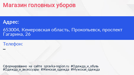 Магазин головных уборов по адресу 653004, Кемеровская область, Прокопьевск, проспект Гагарина, 26 в дальнейшем Организация, размещена в следующих категориях: