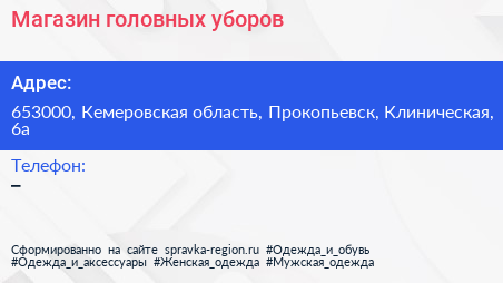 Магазин головных уборов по адресу 653000, Кемеровская область, Прокопьевск, Клиническая, 6а в дальнейшем Организация, размещена в следующих категориях: