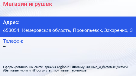 Магазин игрушек по адресу 653054, Кемеровская область, Прокопьевск, Захаренко, 3 в дальнейшем Организация, размещена в следующих категориях: