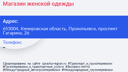 Магазин женской одежды по адресу 653004, Кемеровская область, Прокопьевск, проспект Гагарина, 26 в дальнейшем Организация, размещена в следующих категориях: