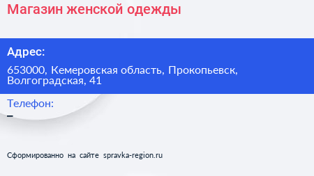 Магазин женской одежды по адресу 653000, Кемеровская область, Прокопьевск, Волгоградская, 41 в дальнейшем Организация, размещена в следующих категориях: