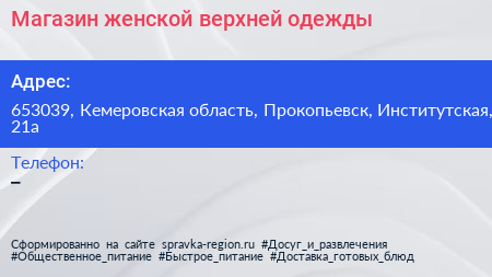 Магазин женской верхней одежды по адресу 653039, Кемеровская область, Прокопьевск, Институтская, 21а в дальнейшем Организация, размещена в следующих категориях: