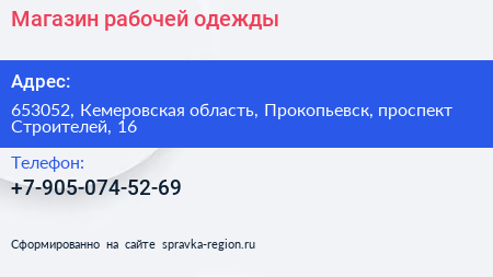 Магазин рабочей одежды по адресу 653052, Кемеровская область, Прокопьевск, проспект Строителей, 16 в дальнейшем Организация, размещена в следующих категориях: