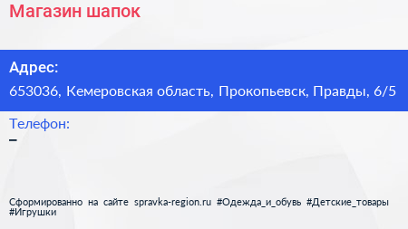 Магазин шапок по адресу 653036, Кемеровская область, Прокопьевск, Правды, 6/5 в дальнейшем Организация, размещена в следующих категориях: