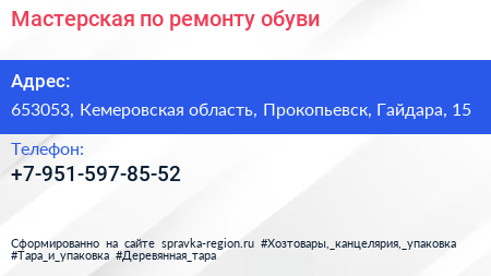Мастерская по ремонту обуви по адресу 653053, Кемеровская область, Прокопьевск, Гайдара, 15 в дальнейшем Организация, размещена в следующих категориях: