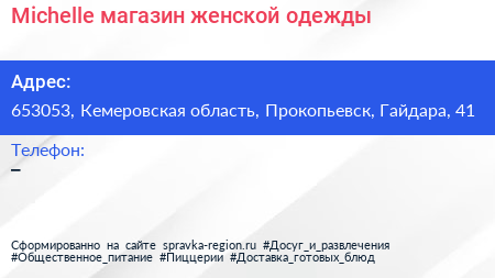 Michelle, магазин женской одежды по адресу 653053, Кемеровская область, Прокопьевск, Гайдара, 41 в дальнейшем Организация, размещена в следующих категориях: