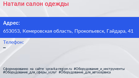 Натали, салон одежды по адресу 653053, Кемеровская область, Прокопьевск, Гайдара, 41 в дальнейшем Организация, размещена в следующих категориях: