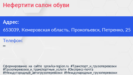 Нефертити, салон обуви по адресу 653039, Кемеровская область, Прокопьевск, Петренко, 25 в дальнейшем Организация, размещена в следующих категориях: