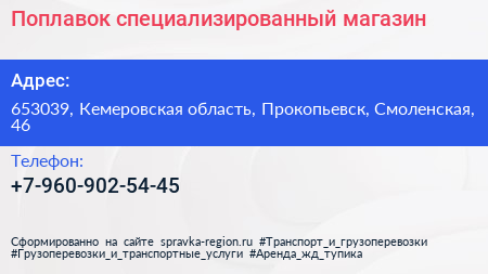 Поплавок, специализированный магазин по адресу 653039, Кемеровская область, Прокопьевск, Смоленская, 46 в дальнейшем Организация, размещена в следующих категориях:
