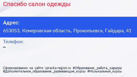 Спасибо, салон одежды по адресу 653053, Кемеровская область, Прокопьевск, Гайдара, 41 в дальнейшем Организация, размещена в следующих категориях: