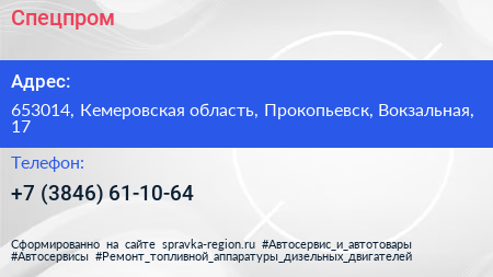 Спецпром по адресу 653014, Кемеровская область, Прокопьевск, Вокзальная, 17 в дальнейшем Организация, размещена в следующих категориях: