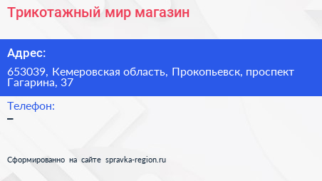 Трикотажный мир, магазин по адресу 653039, Кемеровская область, Прокопьевск, проспект Гагарина, 37 в дальнейшем Организация, размещена в следующих категориях: