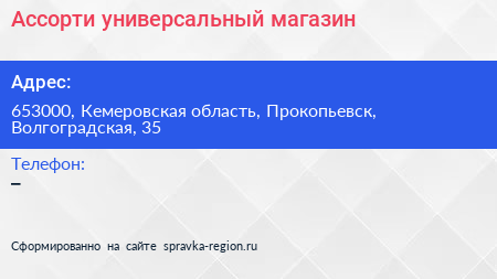 Ассорти, универсальный магазин по адресу 653000, Кемеровская область, Прокопьевск, Волгоградская, 35 в дальнейшем Организация, размещена в следующих категориях: