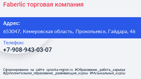 Faberlic, торговая компания по адресу 653047, Кемеровская область, Прокопьевск, Гайдара, 46 в дальнейшем Организация, размещена в следующих категориях: