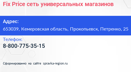 Fix Price, сеть универсальных магазинов по адресу 653039, Кемеровская область, Прокопьевск, Петренко, 25 в дальнейшем Организация, размещена в следующих категориях: