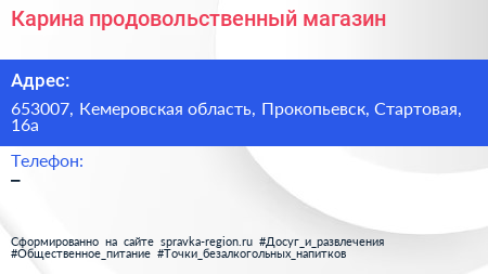 Карина, продовольственный магазин по адресу 653007, Кемеровская область, Прокопьевск, Стартовая, 16а в дальнейшем Организация, размещена в следующих категориях: