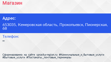 Магазин по адресу 653035, Кемеровская область, Прокопьевск, Пионерская, 68 в дальнейшем Организация, размещена в следующих категориях: