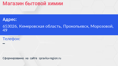 Магазин бытовой химии по адресу 653026, Кемеровская область, Прокопьевск, Морозовой, 49 в дальнейшем Организация, размещена в следующих категориях: