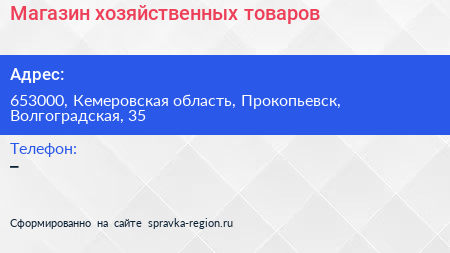 Магазин хозяйственных товаров по адресу 653000, Кемеровская область, Прокопьевск, Волгоградская, 35 в дальнейшем Организация, размещена в следующих категориях: