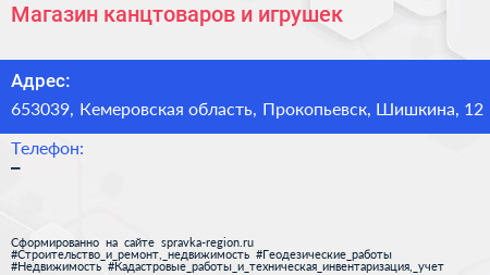 Магазин канцтоваров и игрушек по адресу 653039, Кемеровская область, Прокопьевск, Шишкина, 12 в дальнейшем Организация, размещена в следующих категориях: