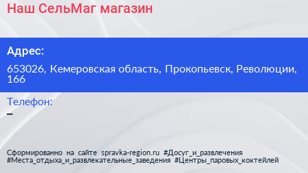Наш СельМаг, магазин по адресу 653026, Кемеровская область, Прокопьевск, Революции, 166 в дальнейшем Организация, размещена в следующих категориях: