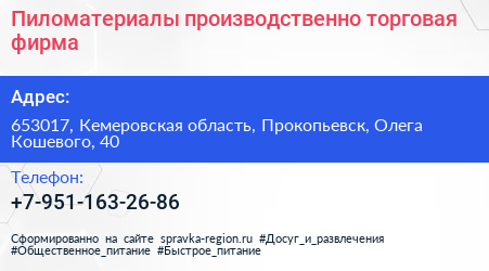 Пиломатериалы, производственно-торговая фирма по адресу 653017, Кемеровская область, Прокопьевск, Олега Кошевого, 40 в дальнейшем Организация, размещена в следующих категориях:
