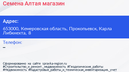 Семена Алтая, магазин по адресу 653000, Кемеровская область, Прокопьевск, Карла Либкнехта, 8 в дальнейшем Организация, размещена в следующих категориях: