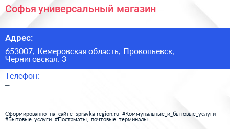 Софья, универсальный магазин по адресу 653007, Кемеровская область, Прокопьевск, Черниговская, 3 в дальнейшем Организация, размещена в следующих категориях: