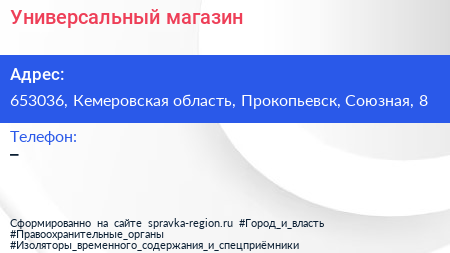 Универсальный магазин по адресу 653036, Кемеровская область, Прокопьевск, Союзная, 8 в дальнейшем Организация, размещена в следующих категориях: