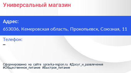 Универсальный магазин по адресу 653036, Кемеровская область, Прокопьевск, Союзная, 11 в дальнейшем Организация, размещена в следующих категориях: