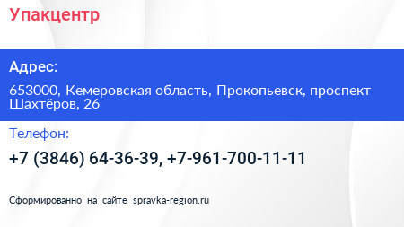 Упакцентр по адресу 653000, Кемеровская область, Прокопьевск, проспект Шахтёров, 26 в дальнейшем Организация, размещена в следующих категориях: