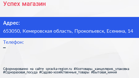 Успех, магазин по адресу 653050, Кемеровская область, Прокопьевск, Есенина, 14 в дальнейшем Организация, размещена в следующих категориях: