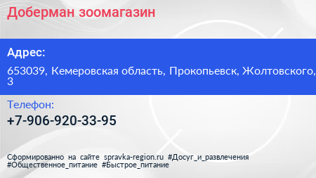Доберман, зоомагазин по адресу 653039, Кемеровская область, Прокопьевск, Жолтовского, 3 в дальнейшем Организация, размещена в следующих категориях: