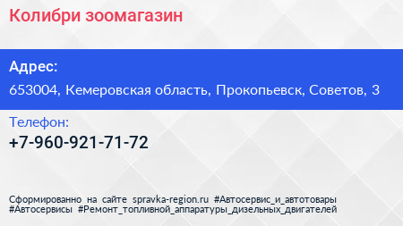 Колибри, зоомагазин по адресу 653004, Кемеровская область, Прокопьевск, Советов, 3 в дальнейшем Организация, размещена в следующих категориях: