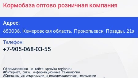 Кормобаза, оптово-розничная компания по адресу 653036, Кемеровская область, Прокопьевск, Правды, 21а в дальнейшем Организация, размещена в следующих категориях: