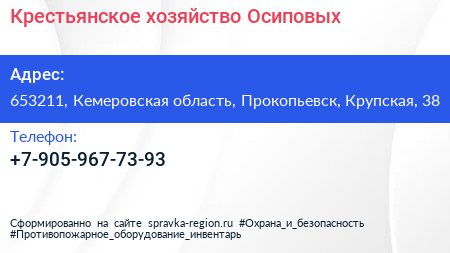 Крестьянское хозяйство Осиповых по адресу 653211, Кемеровская область, Прокопьевск, Крупская, 38 в дальнейшем Организация, размещена в следующих категориях: